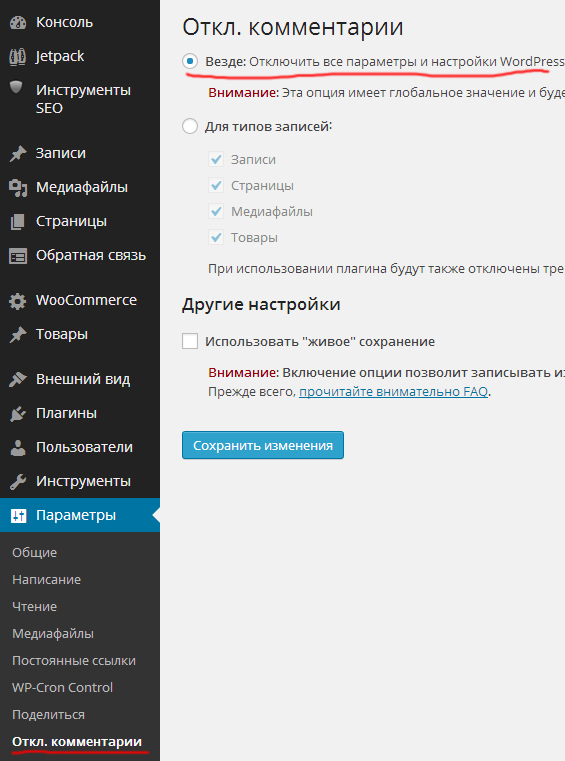 Дотступ к настройках которого осуществляется через Параметры ⇒ Откл. комментарии